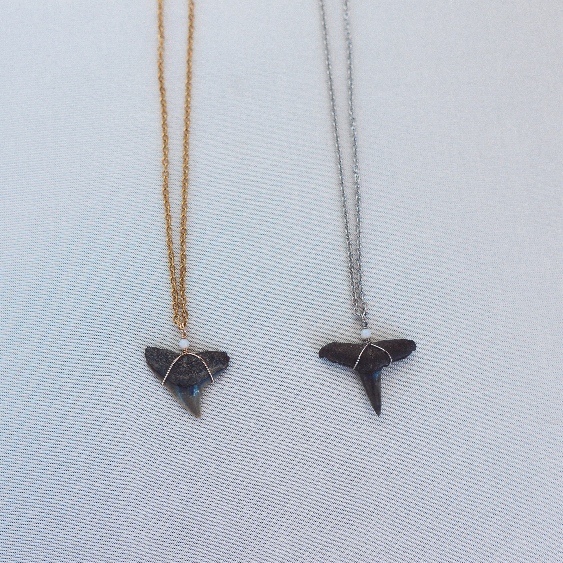 Each piece features a genuine fossilized shark tooth and carefully selected stones, making every design one of a kind.